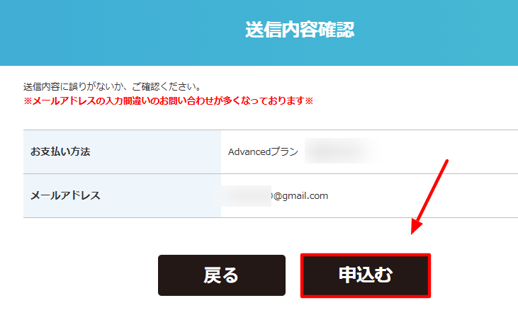 選択したプランに誤りが無いか確認し申し込むボタンをクリックします。
