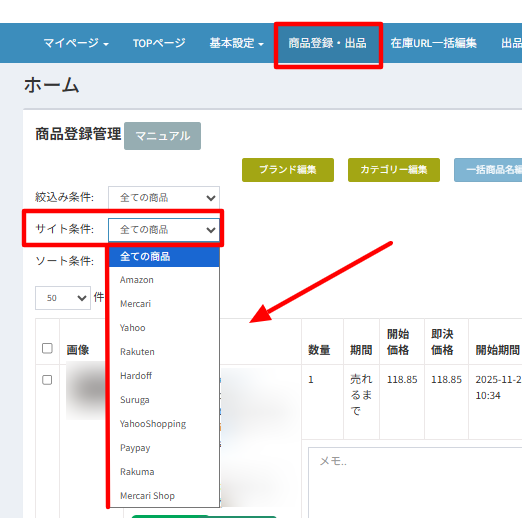 ツールメニュー≫商品登録・出品≫サイト条件≫すべてのサイトから確認いただけます。