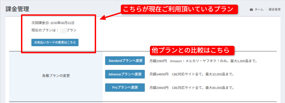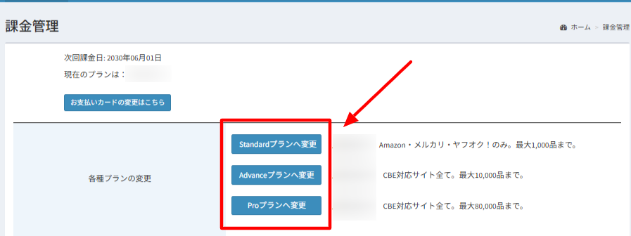プラン変更を行うにはツールメニュー≫マイページ≫課金管理を開き